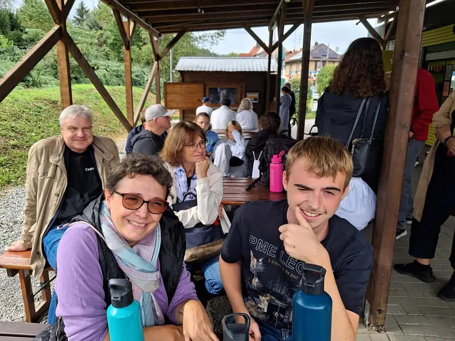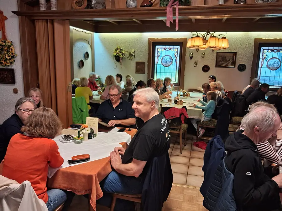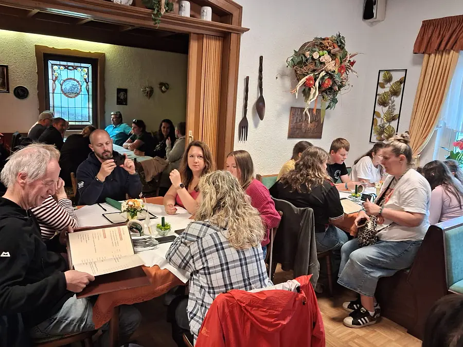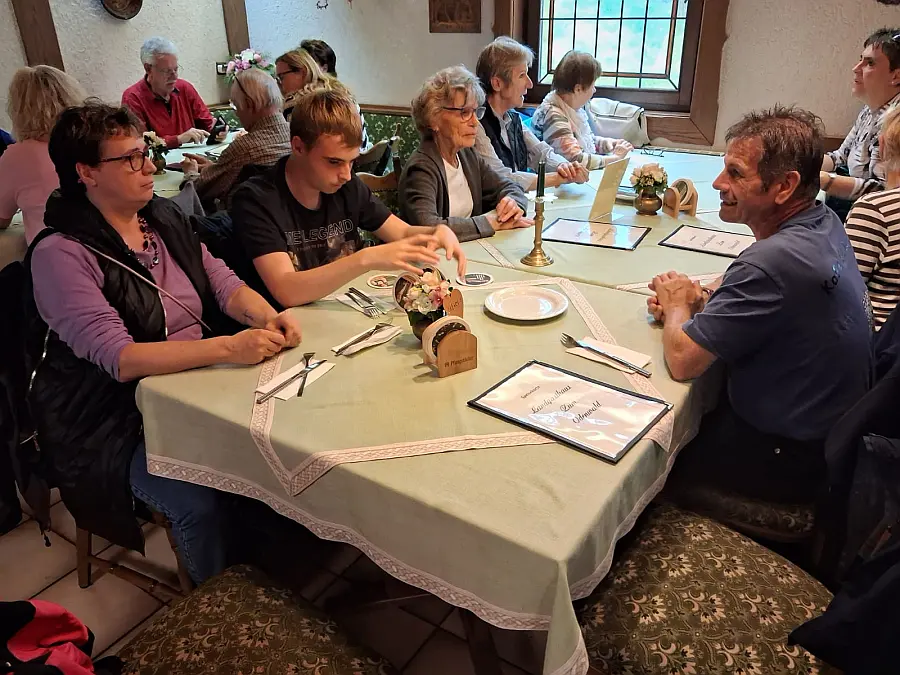 Auf der Rückfahrt nach Wald-Michelbach setzte dann der angekündigte Regen ein. Dank der überdachten Draisinen blieb die Stimmung aber ungetrübt. Lediglich der geplante Rundgang durch die historische Altstadt musste leider entfallen. Stattdessen ging es direkt weiter nach Kreidach ins Gasthaus „Zum Odenwald“. Bei einem leckeren Abendessen ließen die Teilnehmer den Tag in geselliger Runde ausklingen, bevor der Bus alle wohlbehalten zurück nach Durlach brachte.